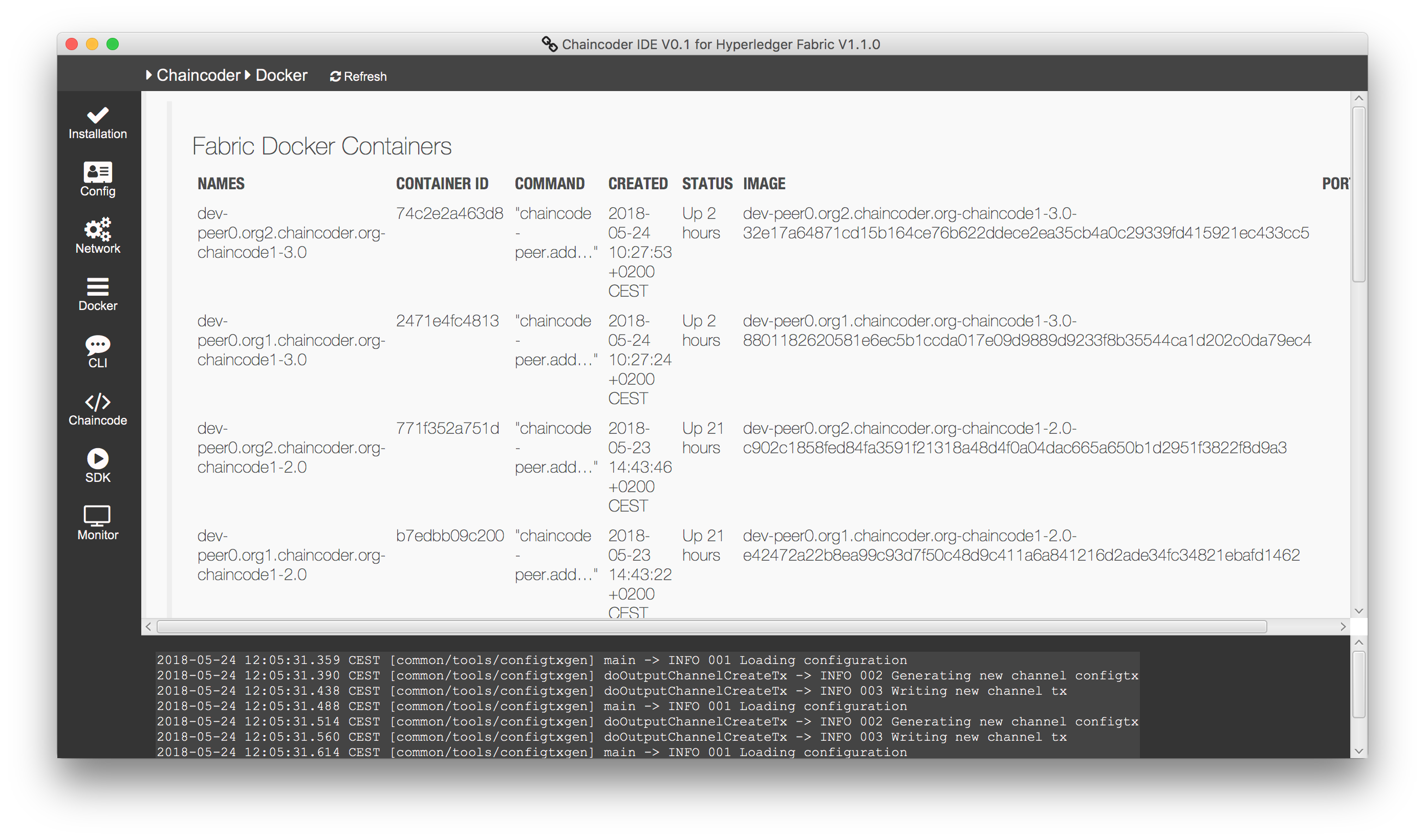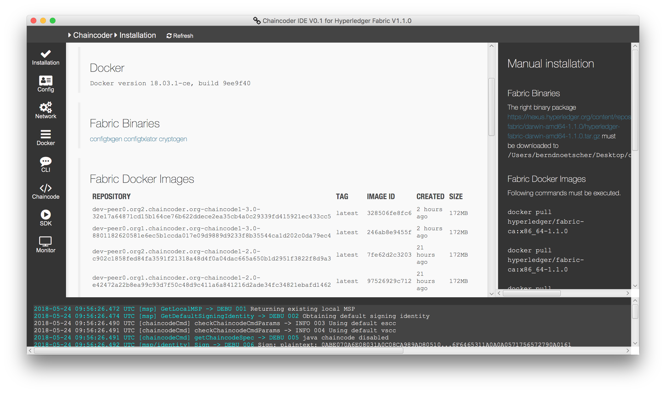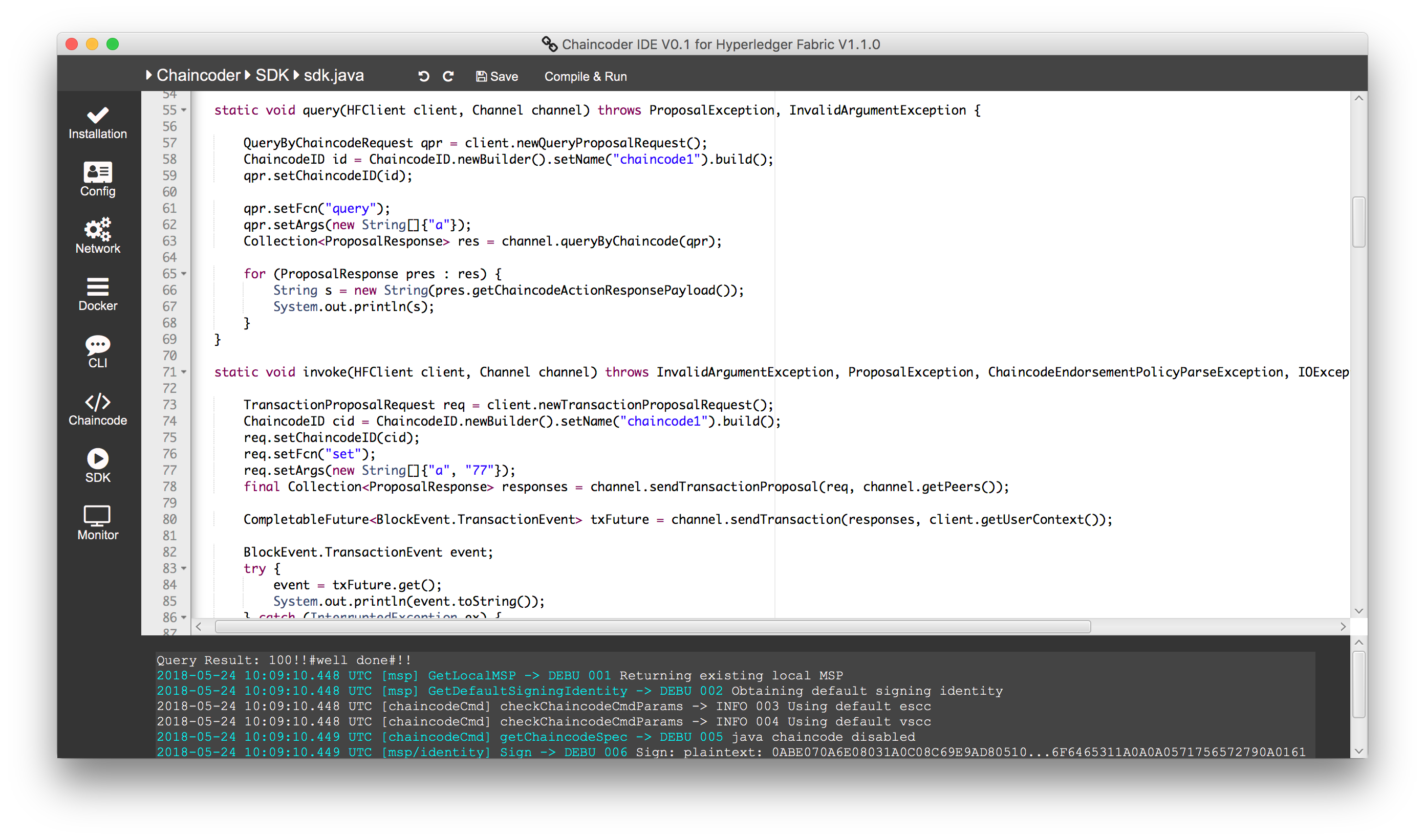It helps you with the correct installation as it automatically performs the downloads of docker images and fabric binaries and checks installation requirements like docker. Chaincoder currently supports a Java SDK client and the CLI which can be used to interact with a private blockchain in Hyperledger Fabric. Chaincode itself can be written in Go, Node.js or Java. It uses the "dev mode" for faster Go chaincode (smart contract) compilation.
