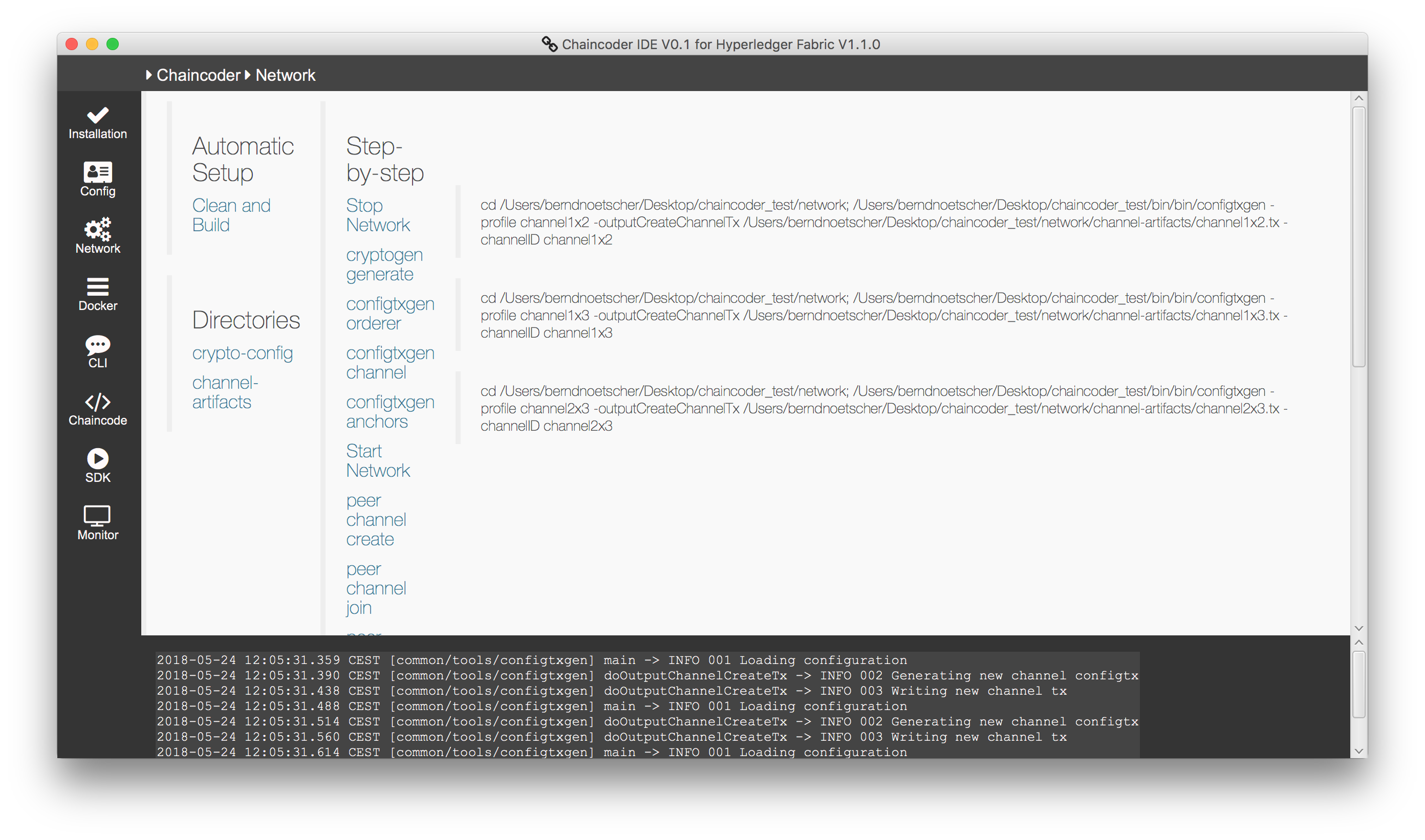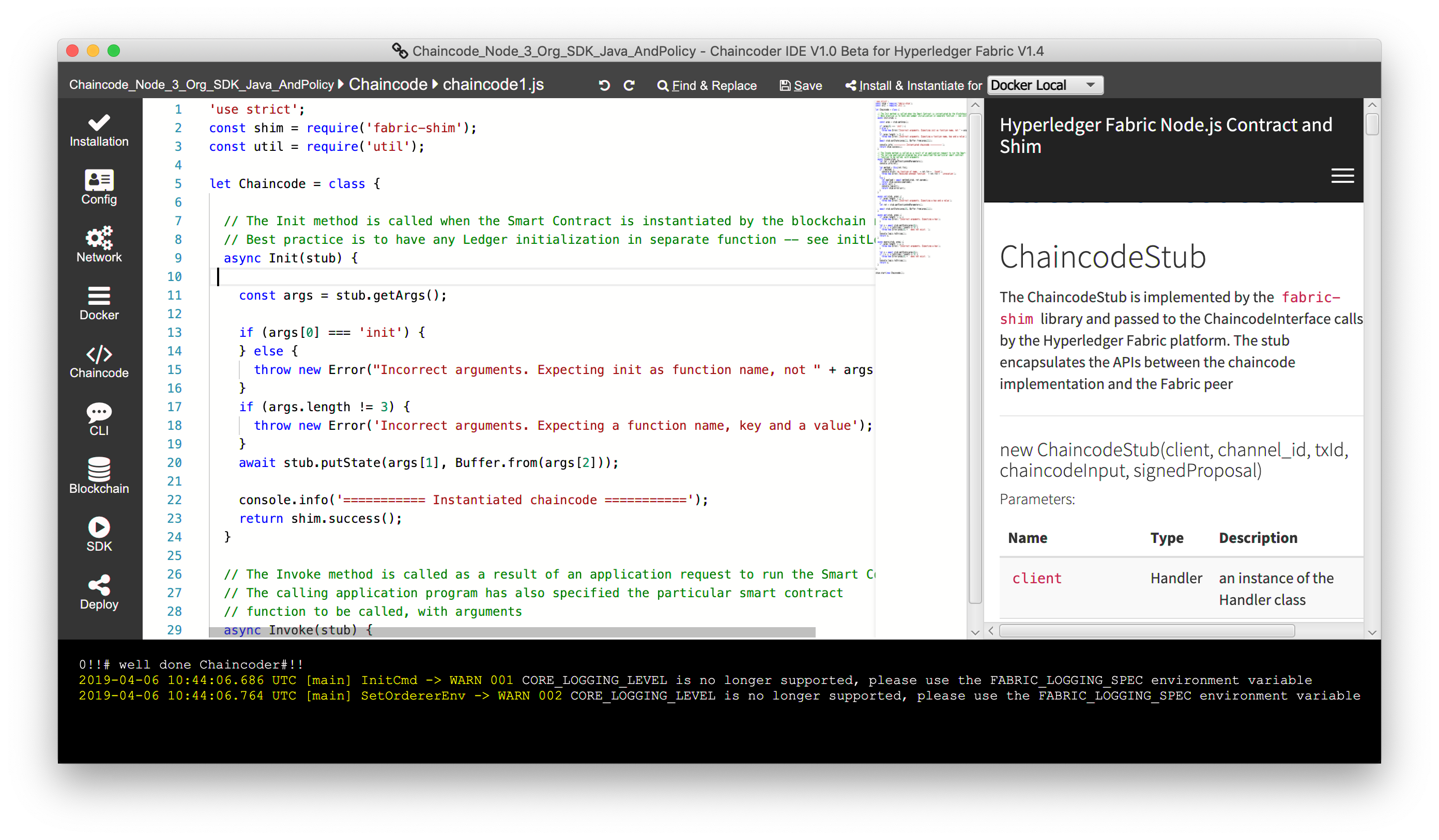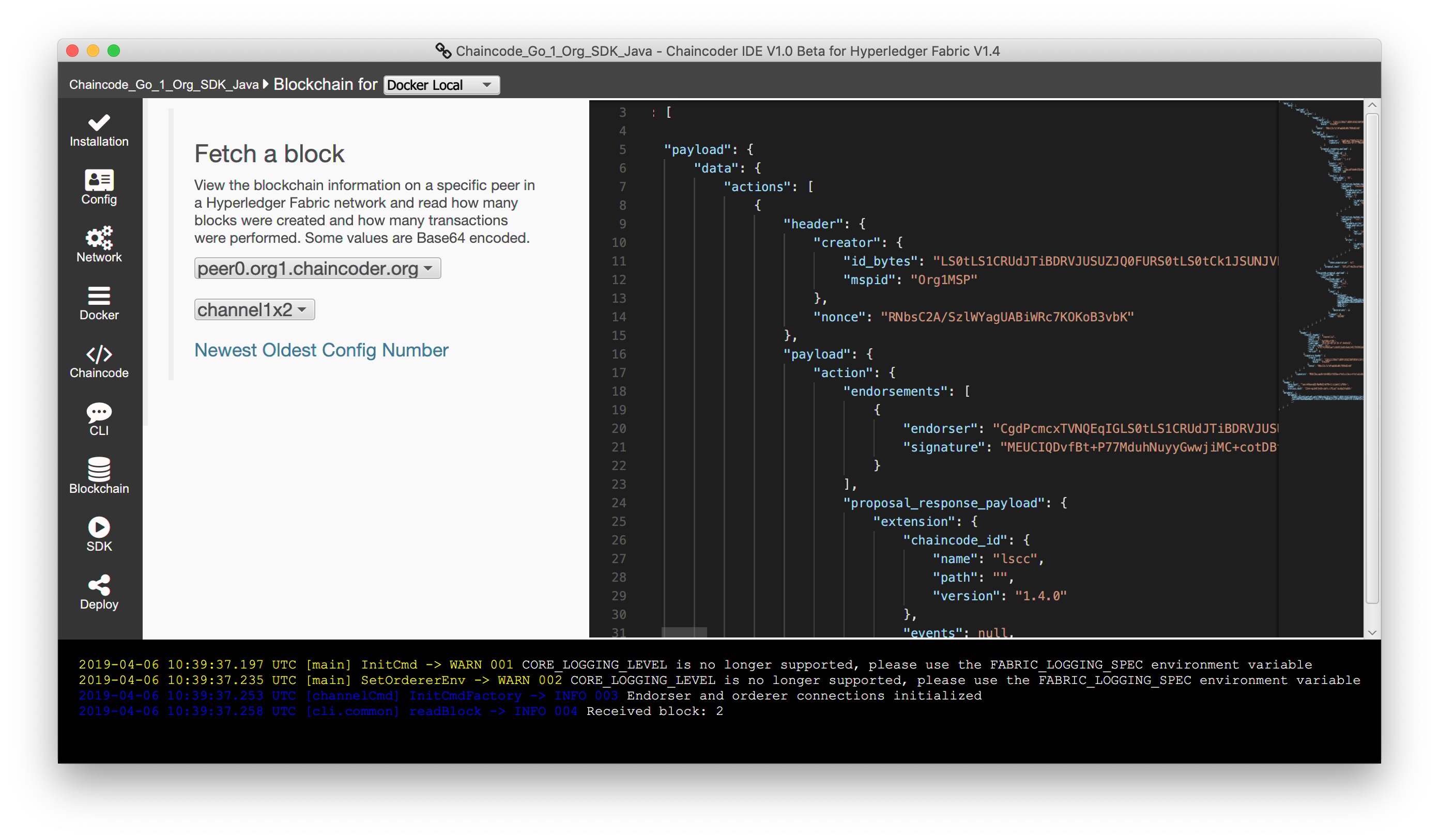 It helps you with the correct installation as it automatically performs the downloads of docker images and fabric binaries and checks installation requirements like docker. Chaincoder currently supports a Java SDK client and the CLI which can be used to interact with a private blockchain in Hyperledger Fabric. Chaincode itself can be written in Go, Node.js or Java. It uses the "dev mode" for faster Go chaincode (smart contract) compilation.
