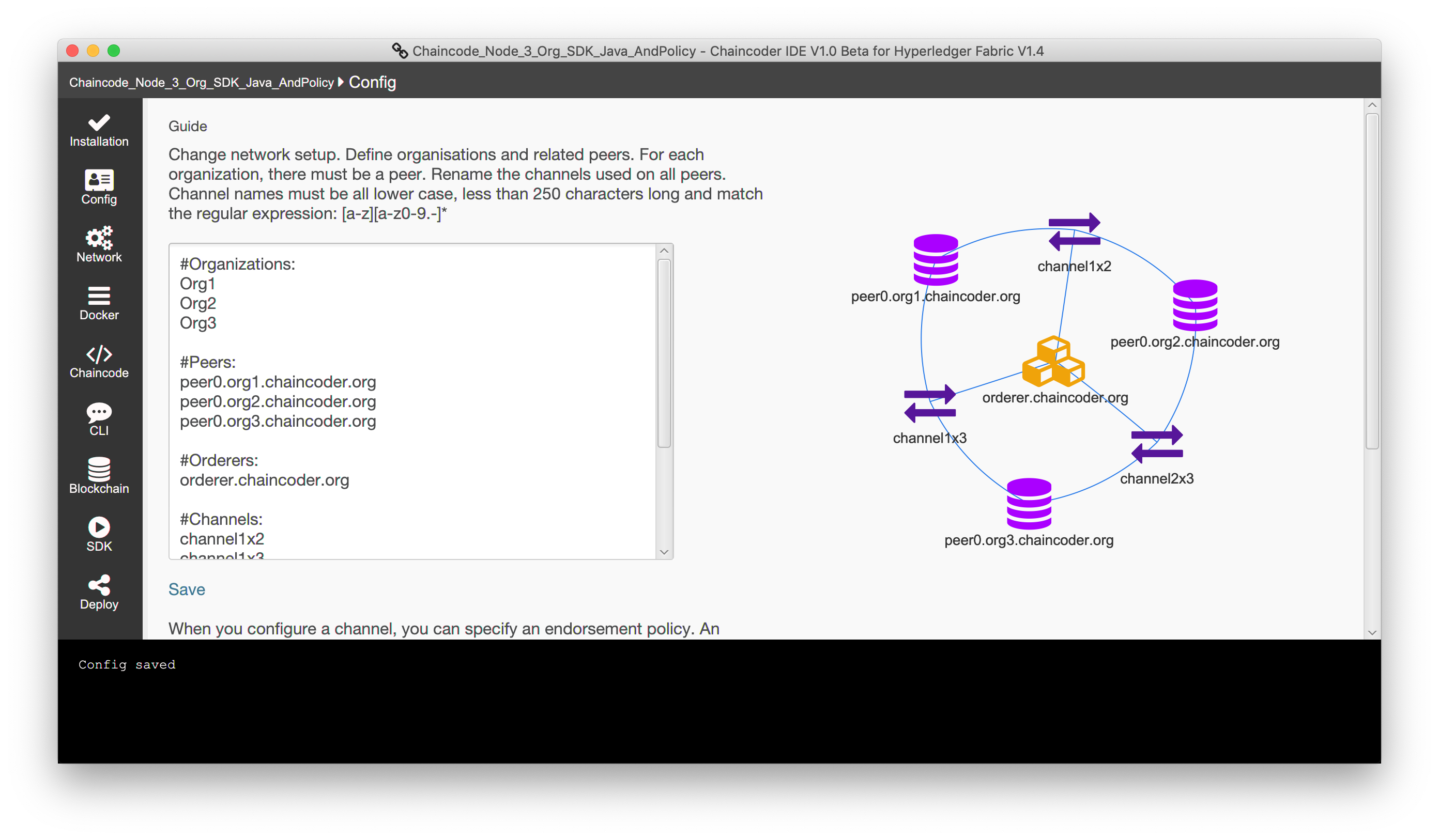 Additionally, Chaincoder lets you define any network setup required. It comes with several examples, one with a unusual network setup, having 3 organisations, which are connected to each other as pairs on 2 channels like a triangle. SOLO is used as orderer and an OR or AND endorsement policy is applied. Changes in configuration can be easily done. For a production release you will need a different setup with Kafka (or other) for the orderer and a different membership service provider.
