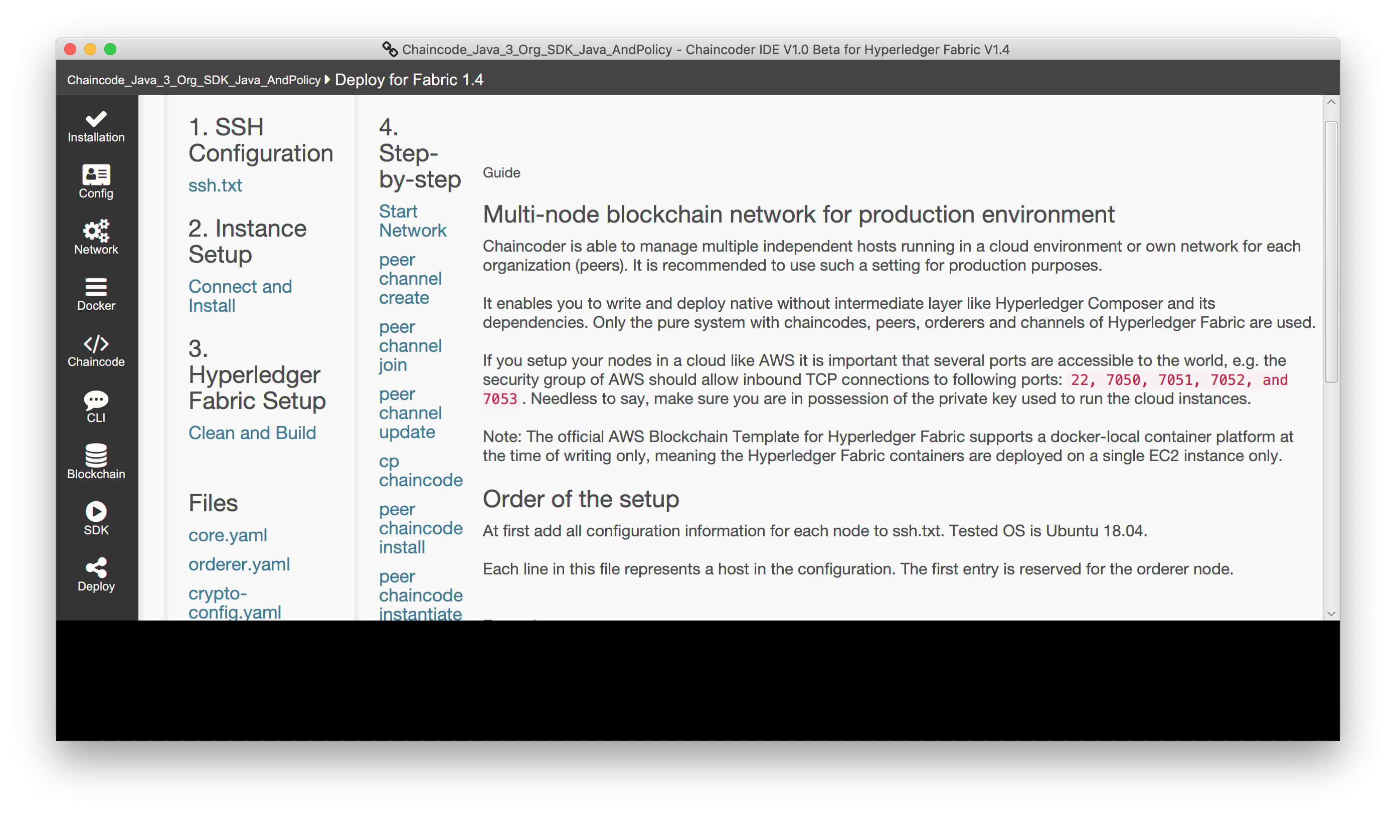 Chaincoder, unlike many others, is able to manage multiple independent hosts running in a cloud environment or own network for each organization (peers). It is recommended to use such a setting for production purposes.